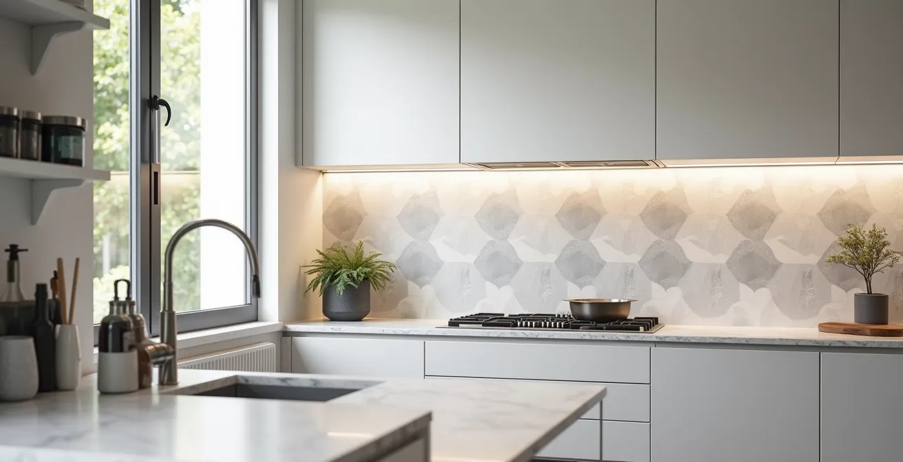 No todos los papeles «para cocina» son iguales. Un papel simplemente «lavable» apenas soporta un paño húmedo ocasional, siendo totalmente inadecuado para el frente de cocina. Para esta zona crítica, necesitas buscar la máxima clasificación: «súper-fregable». Esta categoría está diseñada para resistir limpiezas frecuentes e intensas, pero siempre con las herramientas adecuadas. La clave no es la fuerza, sino la técnica y el producto correcto. Una mancha de aceite se trata primero absorbiendo el exceso con papel de cocina, sin frotar, y luego limpiando con una bayeta de microfibra y una solución de agua con jabón neutro o un desengrasante suave muy diluido.