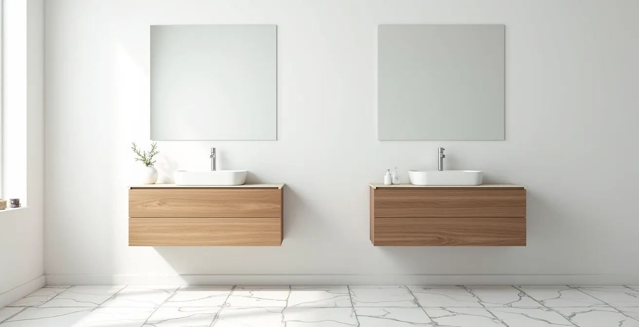 Las soluciones habituales que se escuchan son «elige siempre MDF hidrófugo» o «los suspendidos son mejores porque se limpia fácil por debajo». Si bien estas afirmaciones tienen parte de razón, se quedan en la superficie del problema. La verdadera guerra contra la humedad en un baño con ventilación deficiente no se gana eligiendo entre patas y anclajes a la pared. Se gana en los detalles constructivos, en la calidad invisible del ensamblaje y en la elección de materiales específicos que van más allá de una simple etiqueta de «resistente al agua». Como fabricantes, sabemos que un mueble de baja calidad suspendido se degradará igual de rápido que uno de baja calidad con patas.